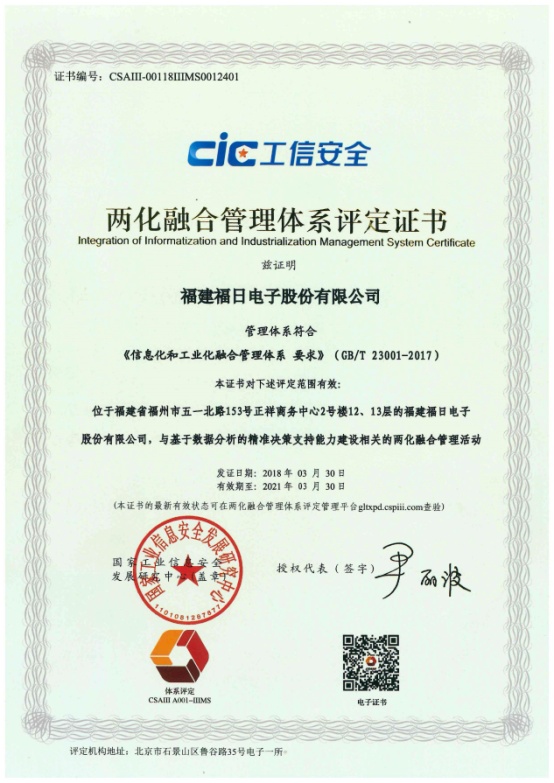 2018年3月30日,福建福日電子股份有限公司獲得了工信部兩化融合管理體系評定證書。公司2017年6月啟動兩化融合管理體系貫標,打造信息化環境下的新型能力——基于數據分析的精準決策支持能力,并于2017年8月列入工信部“2017年兩化融合管理體系貫標試點企業名單”。通過本質貫標,公司在福建省電子信息集團系統先行先試,率先通過兩化融合管理體系貫標評定。公司將不斷完善兩化融合管理體系,促進兩化融合建設成果深化應用,提升公司核心競爭力。