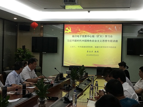 2018年8月23日下午,為進一步興起習近平新時代中國特色社會主義思想“大學習”熱潮,福日電子黨委中心組舉辦(擴大)學習會,特邀中共福建省委黨校、福建行政學院哲學教研部李永杰教授作題為《習近平新時代中國特色社會主義思想解讀》專題講座。公司黨委委員、各成員企業、事業部黨支部書記、副總以上領導、本部助理以上管理人員以及機關支部全體黨員近40人聽取了講座。