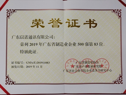 2019年11月13日,由廣東省制造業(yè)協(xié)會、廣東省產(chǎn)業(yè)發(fā)展研究院、廣東省社會科學(xué)院企業(yè)競爭力研究中心共同主辦的2019廣東省制造業(yè)發(fā)展年會暨廣東制造業(yè)500強(qiáng)企業(yè)峰會在廣州隆重舉行,會上發(fā)布了2019年廣東省制造業(yè)500強(qiáng)企業(yè)研究報(bào)告,福日電子二級控股子公司廣東以諾通訊有限公司榮列2019年廣東省制造業(yè)企業(yè)500強(qiáng)第83位。