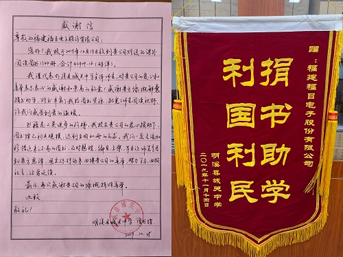 明溪縣城關(guān)中學(xué)寄來(lái)的感謝信和錦旗