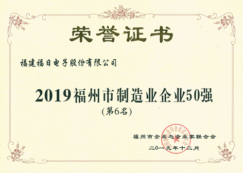 2019年12月27日,2019福州市制造業企業50強發布暨福州市企業與企業家聯合會年會在福州召開。會議發布“2019福州市制造業企業50強”名單并授牌,福建福日電子股份有限公司入選該名單,位列第6名。福日電子黨委書記李震受邀參會。