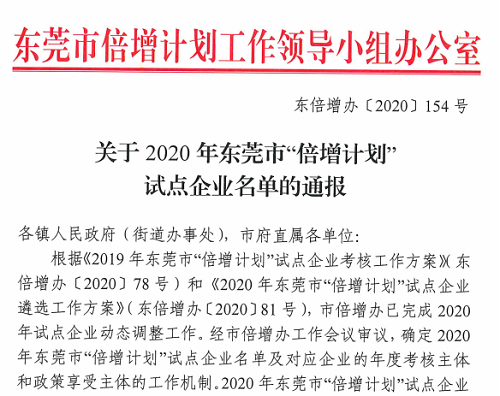 近日,東莞市倍增計劃工作領導小組辦公室發布《關于2020年東莞市“倍增計劃”試點企業名單的通報》,福日電子二級控股子公司廣東以諾通訊有限公司入選 2020年東莞市“倍增計劃”名譽試點企業名單。名譽試點企業指規模大(年營業收入達50億元及以上)、符合東莞市產業發展導向、對東莞市經濟發展影響重大、帶動性強、具備較強倍增能力及意愿的企業。2020年東莞市“倍增計劃”試點企業規模涵蓋大、中、小型企業,在推動東莞市產業可持續高質量發展方面具有良好的模范和引領作用。