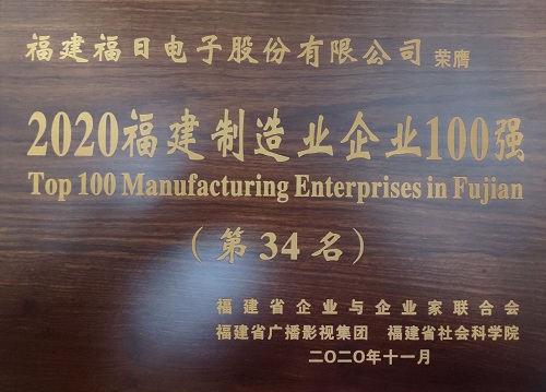 2020年11月20日,2020福建企業100強研究發布大會暨福建企業家大講壇在寧德市舉行,福日電子總裁楊韜受邀參會。會上公布了2020福建企業100強、福建制造業企業100強等榜單,福日電子入選2020福建制造業企業100強(第34名)。