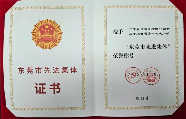 2020年12月25日,2020年東莞市勞動模范、先進工作者和先進集體表彰大會在該市會議大廈舉行,大會表彰了全市54名勞模、6名先進工作者以及30個先進集體,福日電子二級控股子公司廣東以諾通訊有限公司第三事業部運營中心生產部被授予“東莞市先進集體”榮譽稱號。該部門通過成立員工關愛委員會、制定“杰出工匠”“百夫長”方案、落實疫情防控工作、設立員工問題反饋信箱、組織各類文體活動等舉措,推動部門各項工作順利開展,為公司做強做優做大通訊產業貢獻力量。
