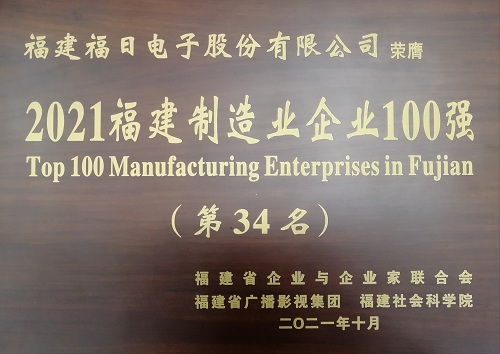 2021年11月3日,2021福建企業100強發布大會暨福建企業家大講壇活動在福州舉行。會上發布了2021福建企業100強、制造業企業100強、服務業企業100強等榜單,福日電子入選2021福建制造業企業100強(第34名)。