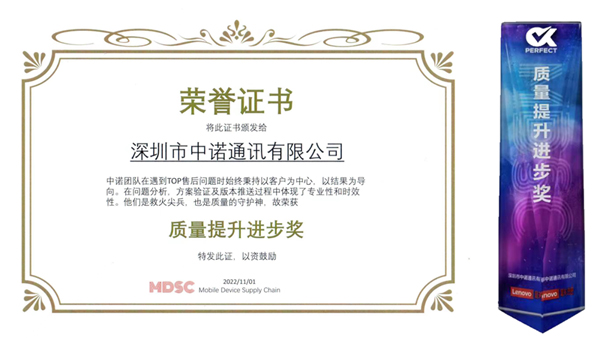 近日,2022年聯想供應商質量論壇主題分享及年度頒獎在線上拉開帷幕,福日電子成員企業深圳市中諾通訊有限公司在線上出席了此次活動。“匠家技最巧,能工事尤精”,今年中諾項目的售后返修率TCRR指標滿足目標要求并持續降低,在本次論壇中獲得多次表揚,并榮獲“聯想2022年度質量提升進步獎”。