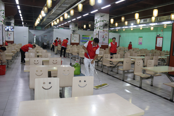 首先進(jìn)行的是公司食堂的清掃清潔。只見志愿者們有的手持抹布,有的揮舞拖把,有的幫忙換水,大家團(tuán)結(jié)協(xié)作分工有序埋頭苦干,對(duì)食堂的打菜窗口、桌椅板凳、地面墻角等處進(jìn)行深入清掃,做到不留衛(wèi)生死角。通過(guò)辛勤勞動(dòng),食堂的環(huán)境衛(wèi)生狀況得到改善,面貌煥然一新。